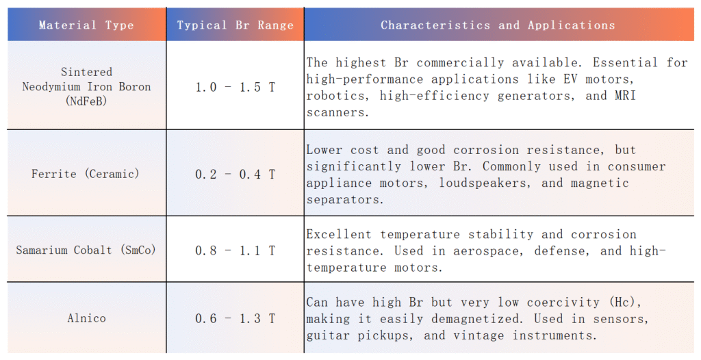 Br is the most critical parameter for determining a magnet’s static performance. Its value directly dictates the magnetic field strength available in a magnetic circuit without any external power source.
